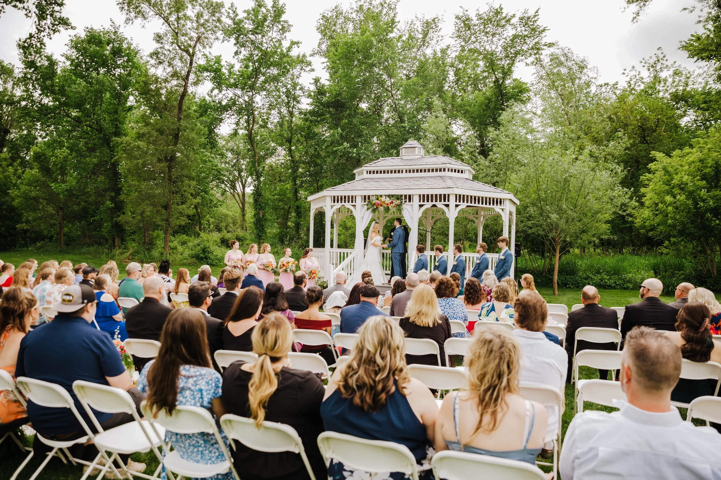 A forest-inspired outdoor venue offering expansive lawns, open prairie, and a charming pavilion that ensures rain is never an issue. Couples appreciate that Rosedale combines natural beauty with professional planning support, exclusive catering through Zest Catering Company, and in-house décor that elevates its rustic charm into a polished, romantic experience. (Photo Credit: Weddings by Carue - Laura)